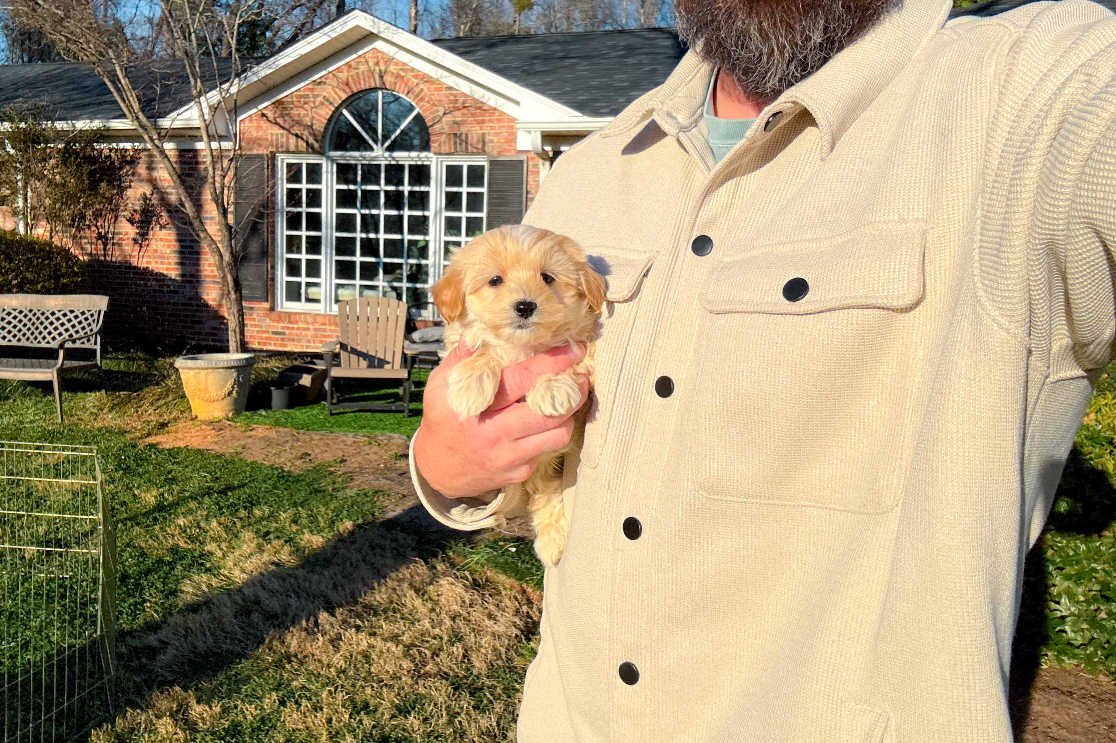 For your new min/toy puppy's housing needs, we recommend an open air Plastic Pen over traditional metal crating. 3 ft x 3 ft and 2 ft high. We will detail the reasons for this in our puppy prep email & pickup presentation. Although metal is a common choice for larger dogs, we've found metal crating seem to work against a mini/toy. We've noticed a decrease in separation anxiety, decrese in urinary tract infections & increase in overall transition success with this open air plastic pen. The rubber feet on the bottom allow grip on any surface. The same pens are sold on Amazon for similar pricing (always within $10). COLOR: WHITE, Expandable. Additional panels can be purchased on amazon to increase pen size if you wish in the future to meet your needs. The pen can be here and ready for you at time of pickup.